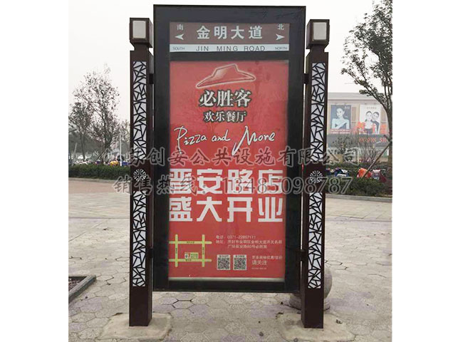 此款路名牌燈箱LMPDX-28主體采用鍍鋅鋼結構,表面采用氟碳金屬烤漆工藝,視窗面板采用鋼化玻璃,燈箱內置LED燈。具有外形美觀、表面耐腐蝕、抗風性能強、使用壽命長等優點。產品的樣式、尺寸、顏色、材質、配置等均可按需定制。