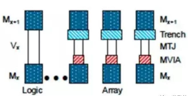 圖2顯示了1 Gb陣列中的pMTJ位以及芯片的BEOL金屬化中的相鄰邏輯區域的集成。