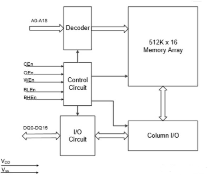 圖中A0~18為地址線,總共19根地址線(即2^19=512K,1K=1024);DQ0~15為數據線,總共16根數據線。CEn是芯片使能信號,低電平有效;OEn是輸出使能信號,低電平有效;WEn是寫使能信號,低電平有效;BLEn和BHEn分別是高字節控制和低字節控制信號;