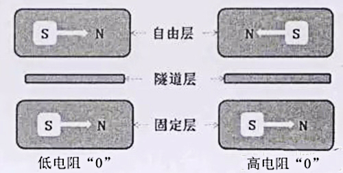 如下圖二所示,MTJ有三層,最上層為自由層,中間是隧道結,下面是固定層。自由層的磁場極化方向是可以改變的,而固定層的磁場方向固定不變。當自由層與固定層的磁場平行時,存儲單元呈現低阻態;當磁場方向相反時,存儲單元呈現高阻態。MRAM通過檢測存儲單元電阻的高低,來判斷所存數據是0還是1。